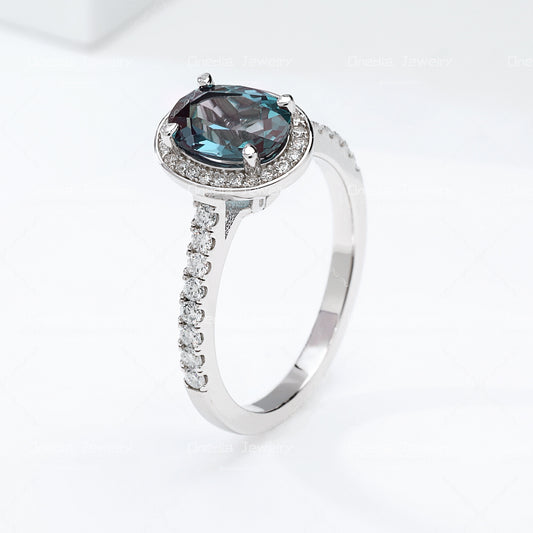 1.5ct Oval Lab Grown Alexandrite Teal color 6x8mm Classic Halo design Engagement ring in 18k white gold