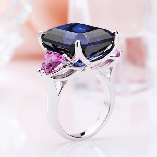10 carats Asscher Cut Royal Blue & Vivid Purple Lab grown Sapphire Three Stone Engagement Ring gold