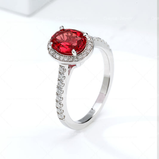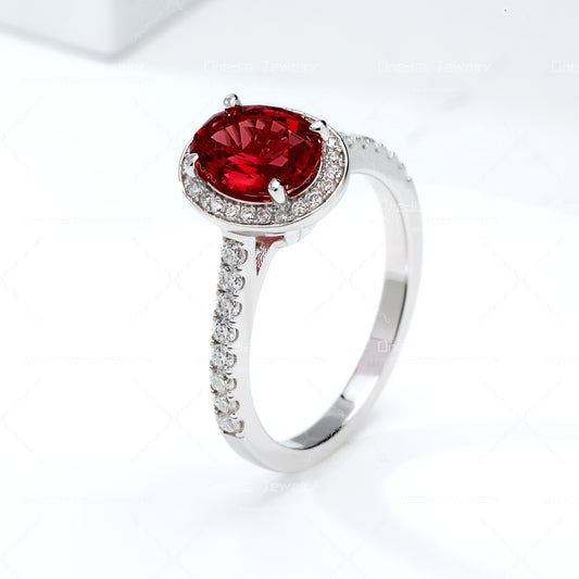 1.5ct Oval Lab Grown Ruby Pigeon Blood Red 6x8mm Classic Halo design Engagement ring in 18k white gold